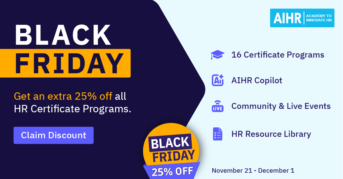 AIHR will be running their biggest sale of the year this Black Friday with an additional 25% discount on all their plans: Certificate Programs, Full Academy License and Team Licenses. Everything is 25% off. The discount runs from November 21st to December 1st, 2025. Click here to access the Black Friday campaign now.