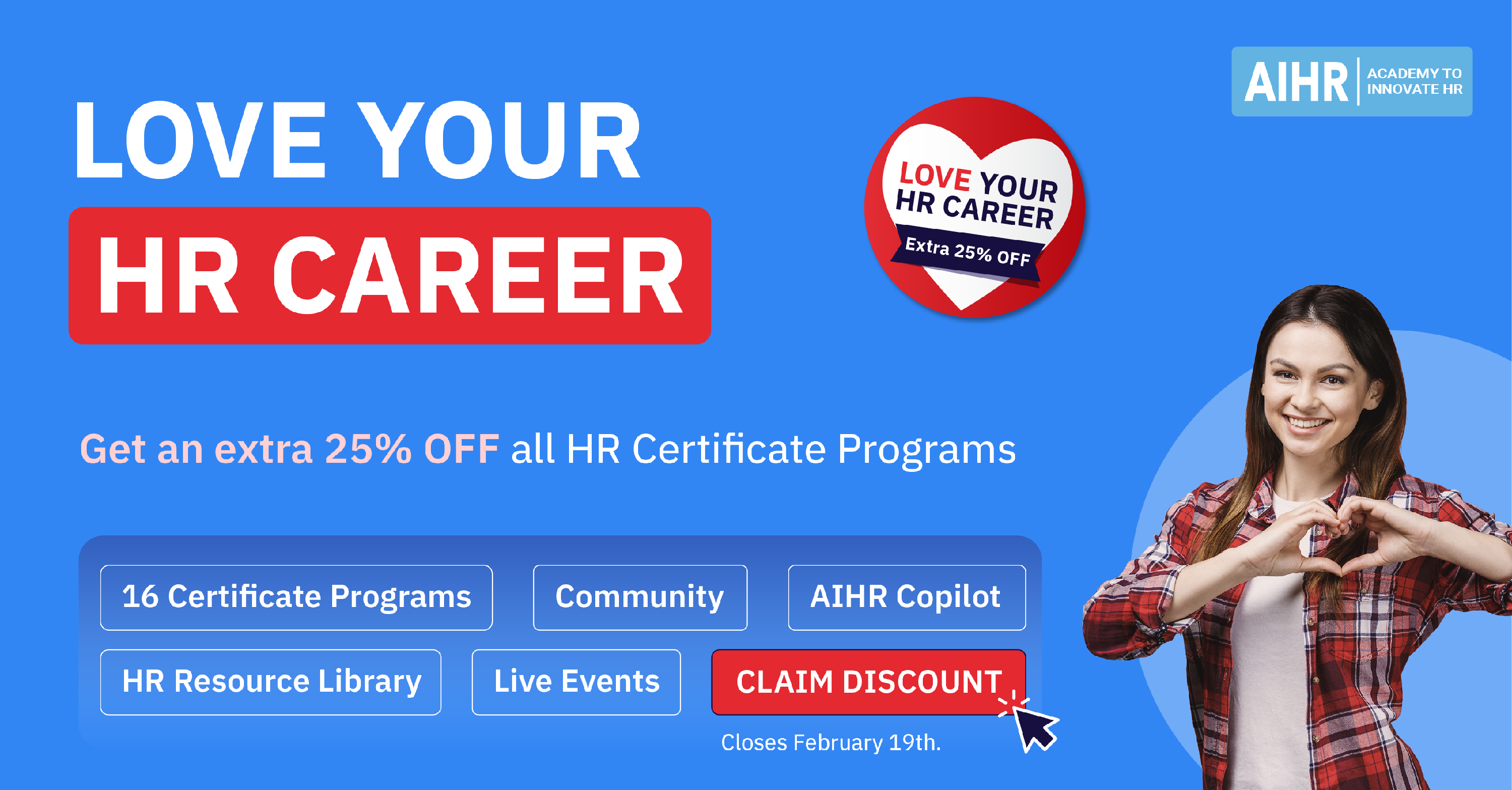 AIHR is launching a February Sale with an additional 25% discount on all individual plans, including Certificate Programs and the Full Academy License. This promotion is called “Love Your HR Career❤️”. It’s designed to inspire HR professionals around the world to rekindle their passion for HR—by reconnecting with what made them fall in love with the profession in the first place ❤️.